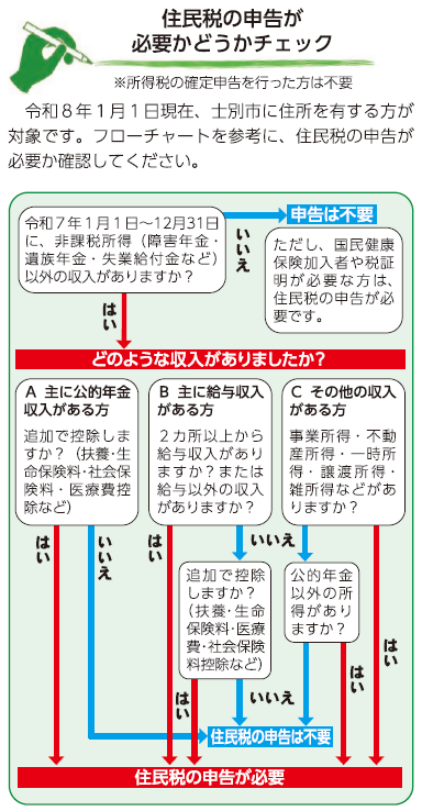 令和8年1月1日現在、士別市に住所を有する方が対象です。住民税フローチャートを参考に、住民税の申告が必要か確認してください。